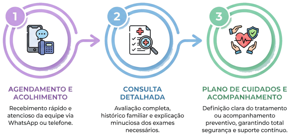 Sabemos que a primeira consulta é um passo de coragem. Por isso, a jornada é planejada para ser o mais tranquila e informativa possível, devolvendo o controle e a clareza para a sua família.